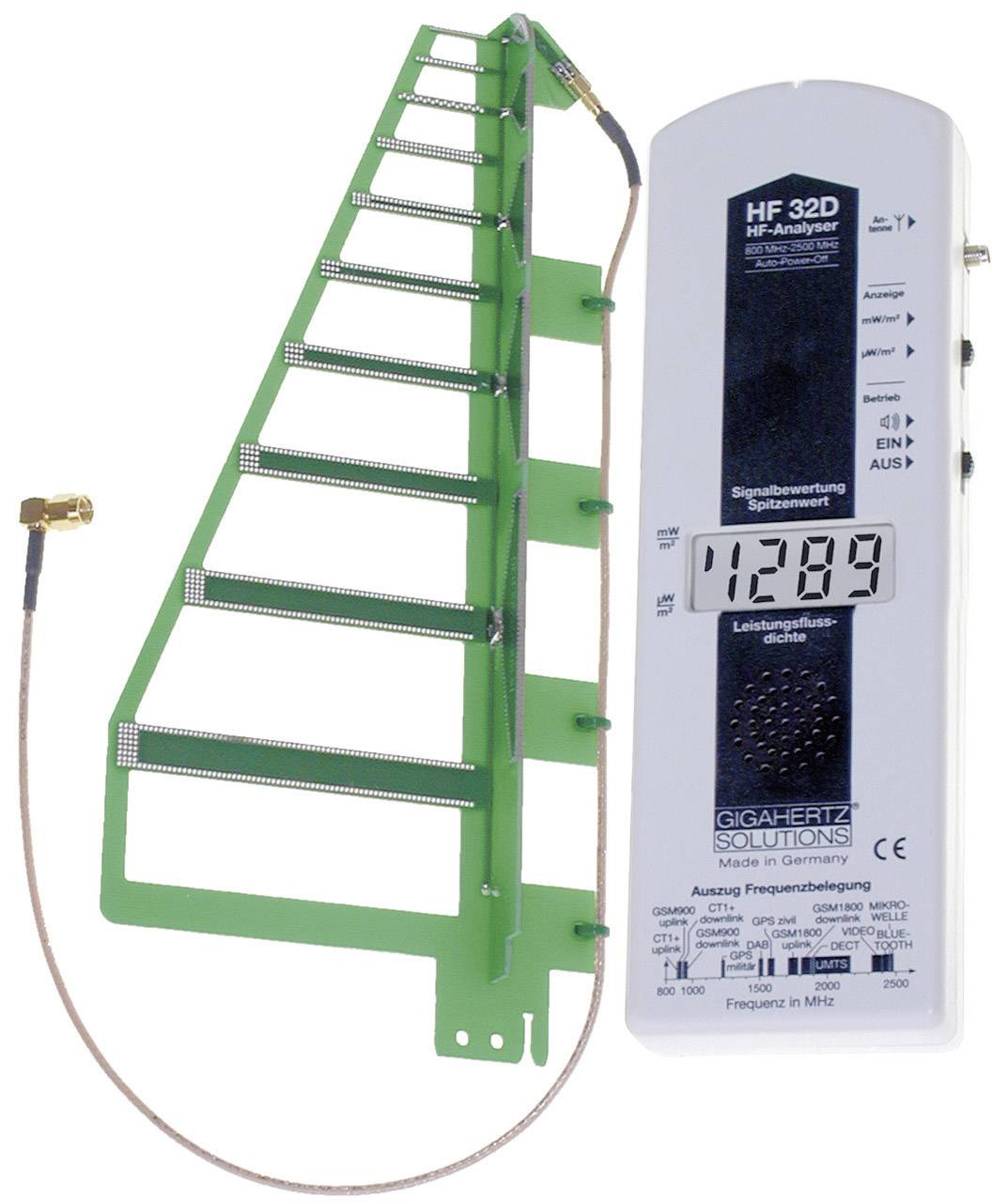 Logaritamsko-periodička antena, jednostavna polarizacija. Mjerni opseg obuhvaća među ostalim impulsni GSM mobilni radio za D1, D2 i E-Plus, UMTS, DECT, WLAN (Bluetooth®) radare u zračnim lukama (ako su u području frekvencije), mikrovalne pećnice.